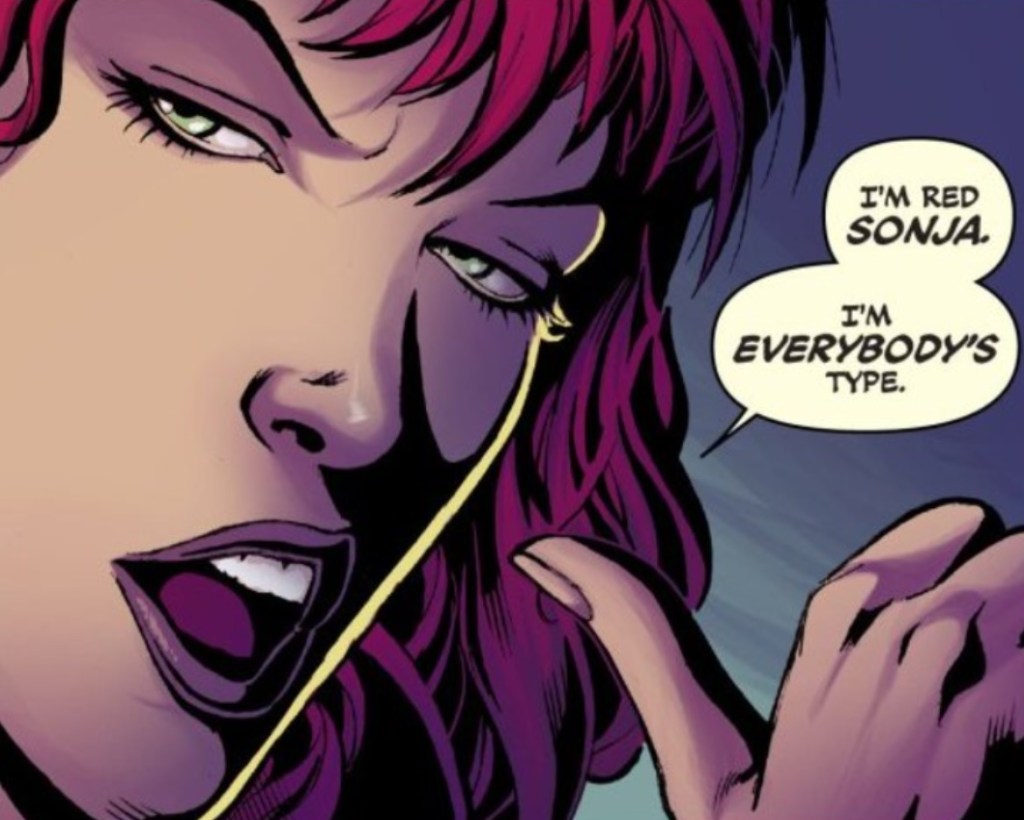 The removal of Sonja’s “curse” opened up numerous…options for the character in the romance department. Simone opted to make her pansexual and randy as all hell. As a result, she’s even more of a loveable, hedonistic sellsword than she was before. Sonja is willing to bed man or woman, and wears her sexuality as yet another sign of empowerment. (The fact that this also partly explains her long-bizarre obsession with wearing a chainmail bikini that offers no actual protection is a small added bonus.)