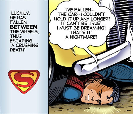 In the story itself, a strange asteroid enters Earth’s orbit. Originating from Krypton, the asteroid has two effects. First, humans in direct contact with it gain super powers. Second, Superman’s own powers begin to diminish while the asteroid is in orbit. He finds this out the hard way: by accidentally dropping a car on himself.