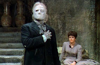 Almost as though to offset the extra-nice Phantom in this play, Lom’s character has a more disturbing visage than his charming yet insane Rains counterpart. His mask covers his whole face save for a single eyehole, which gives him an uncanny look intended to unsettle the audience. Clearly, this version of the story is trying to play up the idea that looks can be deceiving; we have a more frightening Phantom than before, yet he commits almost none of the wrongs that his previous incarnations did.