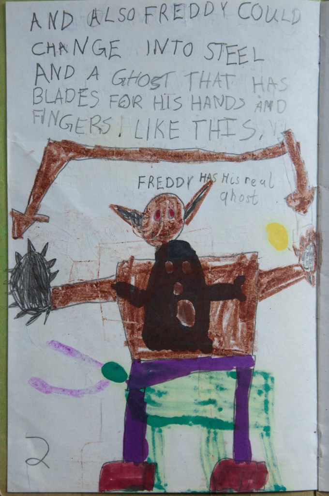 You’ll notice that Freddy is in a mirrored position here when compared to the first page. I believe this was because I didn’t realize that the black marker would seep through the paper, and I had to do something with the inky ghost on the other side.