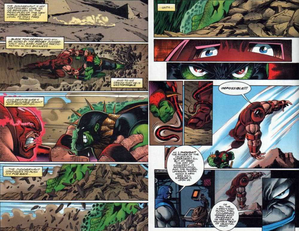 On another point, the issue where the Hulk was busy smacking the Juggernaut around like a little pansy, the story veered toward some character development. Rick Jones, the Hulk’s long-time buddy and sometimes sidekick, tried to stop the Hulk from murdering the Juggernaut and got backhanded into a brick wall. Although it was a glancing blow and Rick had received martial arts training from Captain America, the result was nearly fatal, resulting in short-term memory loss and major paralysis to Rick. The act of hurting Rick caused the Hulk to lose it, ripping out the implants given to him by Apocalypse and leaping away, going back to just being the Hulk instead of being War. In a way, it was a shame that the story had to end so soon. There’s something cathartic about seeing the Hulk just beat guys like the Juggernaut to a pulp. Maybe if there was some way to have him take on the entire Marvel Universe…sort of like a World War…involving the Hulk…but that wouldn’t happen, would it?
