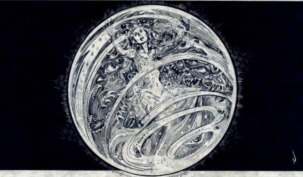 In Time of Troubles, encounters pick you! Wandering through the mist-filled courtyard, the PCs are attacked by “a long, bristle-haired worm, with bright yellow faceted eyes and huge mandibles.” The creature is an illusion, and I can’t really get much of an idea as to what it’s supposed to look like. But that doesn’t matter; it’s the least ill-defined thing in this encounter. Next thing we know, “The semi-illusory effects of Castle Kilgrave have acted to separate the party, and the DM must now follow suit by isolating the players.”