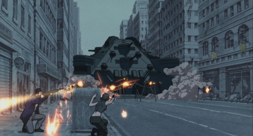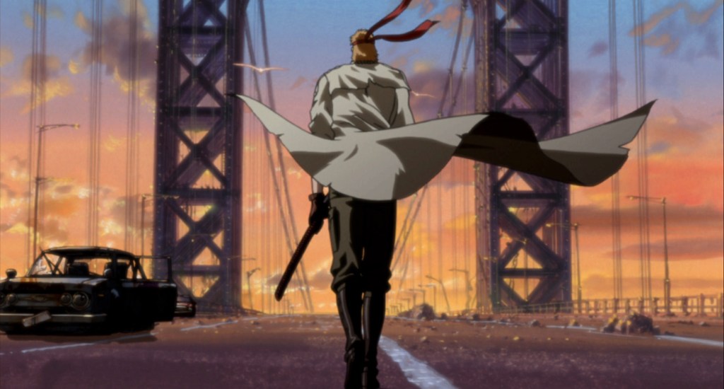 In terms of style, the movie is one of those love it or hate it things. Yoshiaki Kawajiri is the guy responsible for Ninja Scroll and Vampire Hunter D: Bloodlust, and his fingerprints are all over this film. It’s got a ton of anime style to it, so if you like that, this film is awesome. If you don’t, then some of the stuff is downright silly. We’ve got an immortal that fights with a chainsaw. Colin is borderline superhuman, able to block bullets with his sword (he has had 2,000 years of combat training, though). The characters’ outfits, especially for the women, are ridiculous. But it all falls under the general anime style that I’ve learned to love, so I appreciate every over-the-top self-indulgent bit of it.