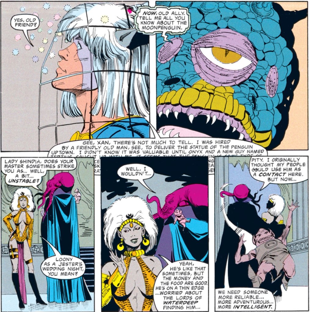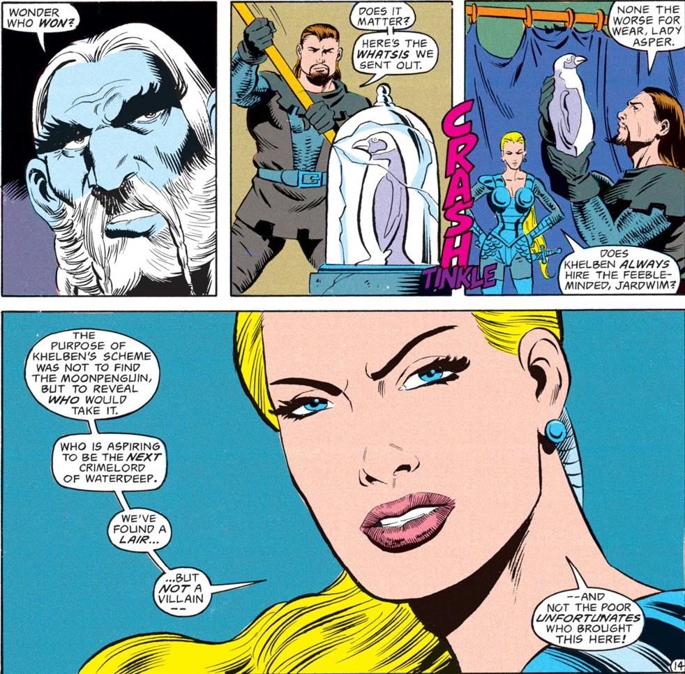 The allies of Khelben and Mirt sneak into Xanathar’s lair to recover the Moonpenguin statue, which itself is a decoy copy of the original made so Khelben can locate Xanathar’s lair. Yes, Khelben intended Timoth to fall into peril, because he’s a lawful neutral master manipulator who doesn’t mind breaking some eggs to make an omelette. Of course, when the eggs are his own, that becomes a bigger issue…