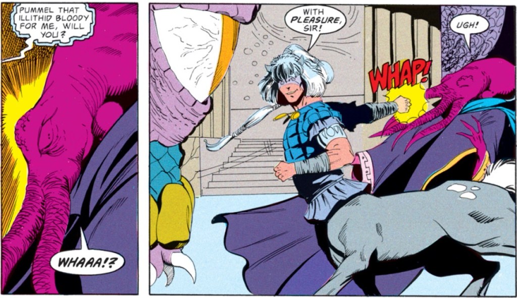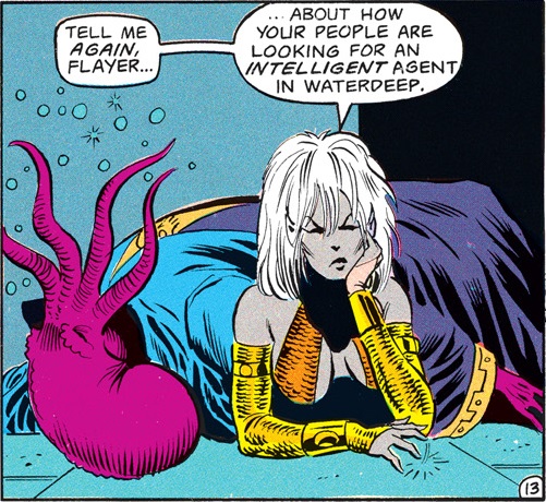 The characters here are practically shrugging to the fourth wall and saying, “It’s a living,” but the comic wisely keeps things grounded in the fictional world by having a woozy mind flayer for the drow to insult.