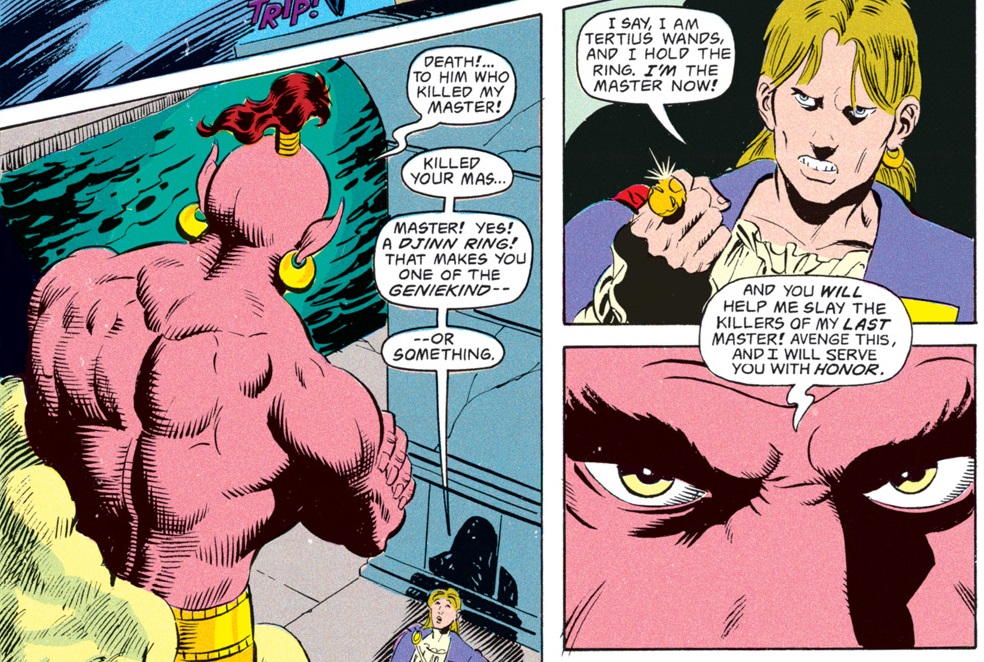 Tertius, meanwhile, learns that it’s very important to let people finish their sentences. When the genie came out of the ring shouting “Death!” he really meanth “Death to him who killed my master!” This allows the silly wizard to make a quick and formidable ally.