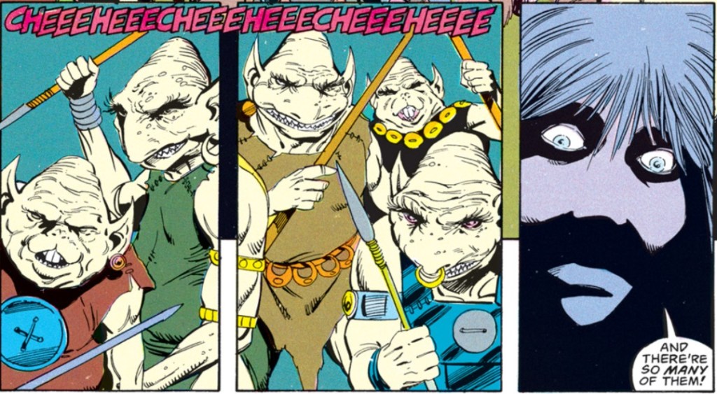 The gremlins work for the mind flayer, who in turn works for an as-yet unseen crime boss known as Xanathar. folks familiar with 5th edition D&D probably recognize the name as belonging to the beholder who adorns the cover of Xanathar’s Guide to Everything, but as of the time of this comic he was less well-known unless you happened to own the supplement Waterdeep and the North, which presented one of my favorite D&D images ever.
