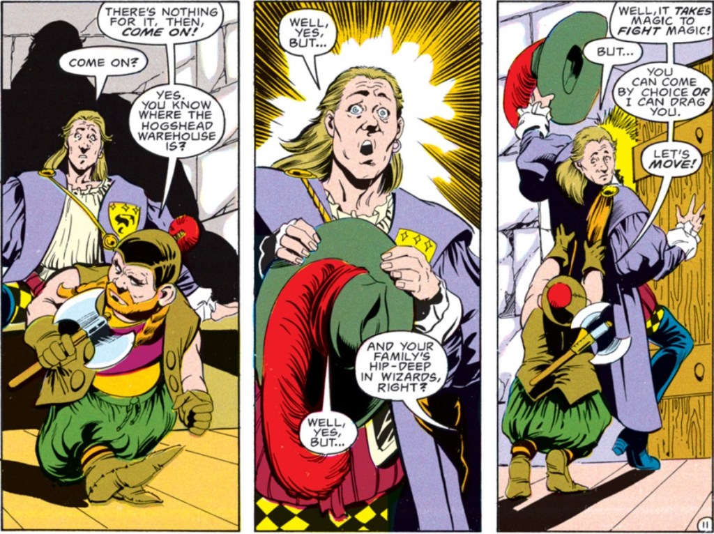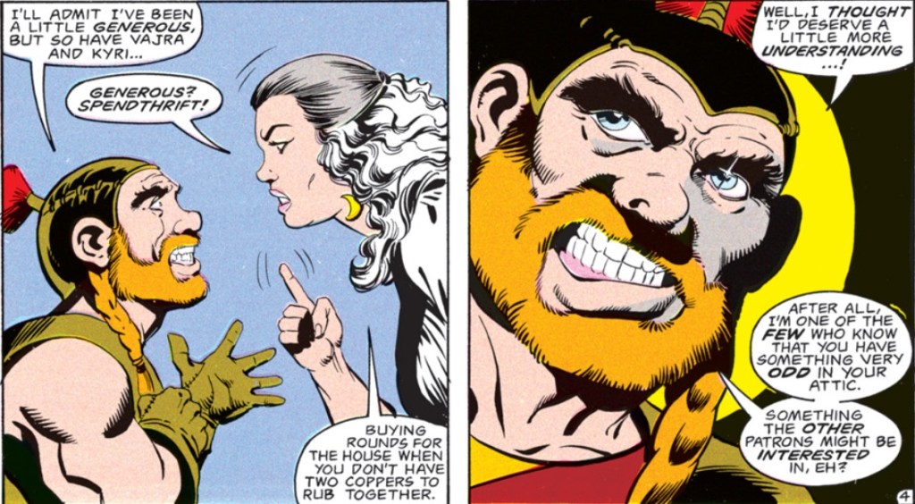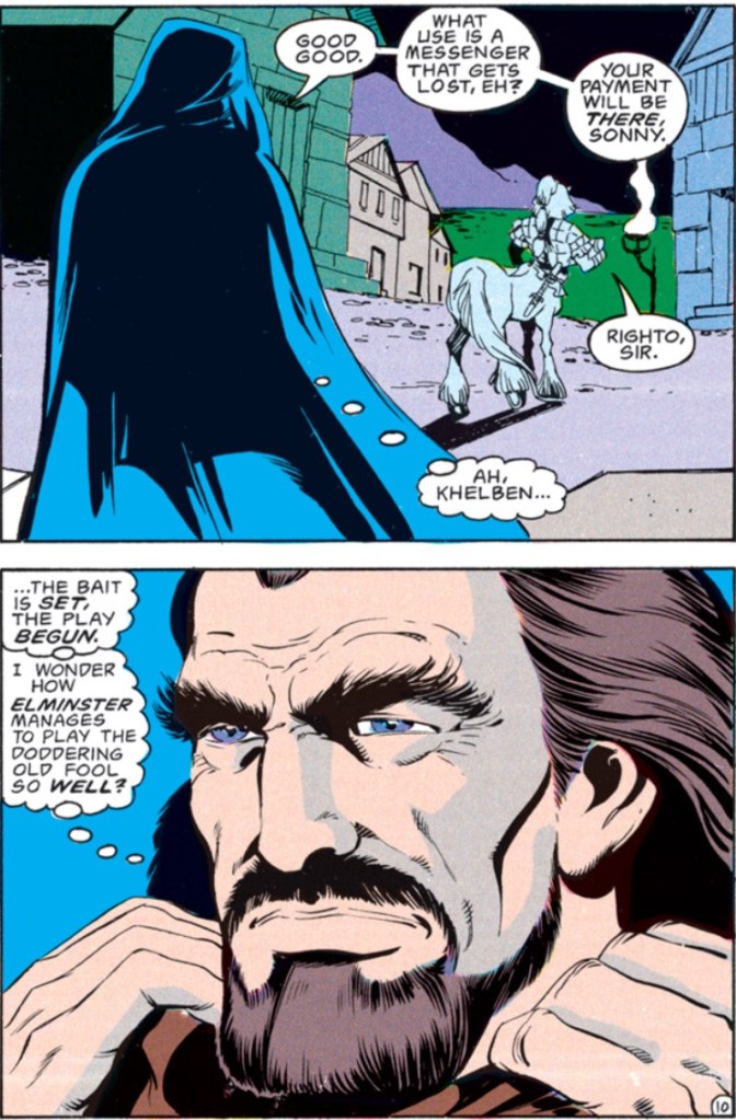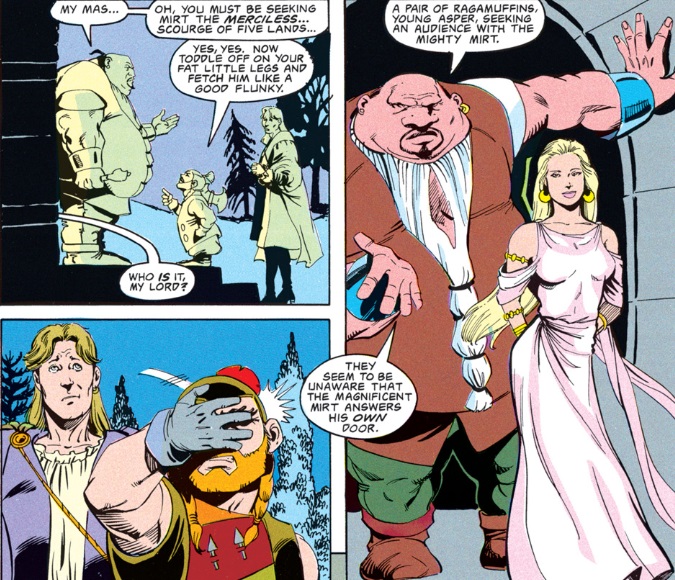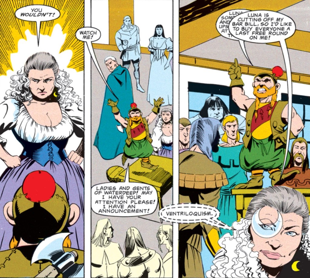 The thing that makes me cringe about Mirt is his relationship to Asper his adopted daughter and wife. Yes, you read that correctly. He took her in as a child, then became her lover when she was old enough, and then married her. D&D used to forbid same-sex relationships, but they were okay with grooming as early as the 1980s. Luckily, that little detail doesn’t get brought up in this comic.