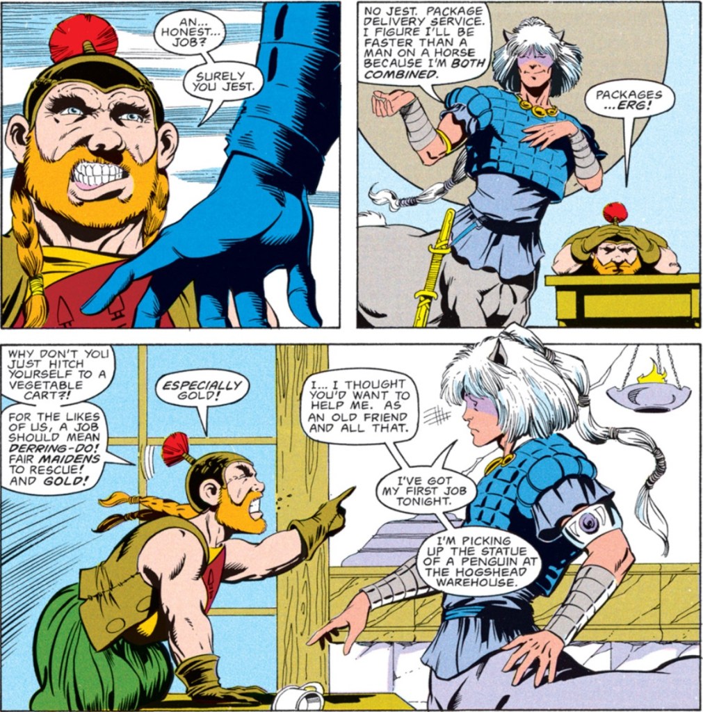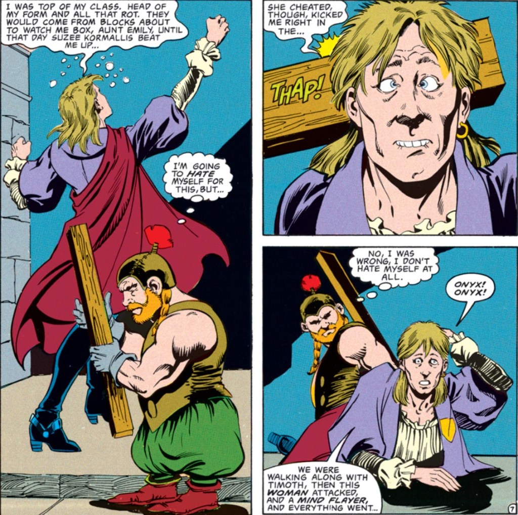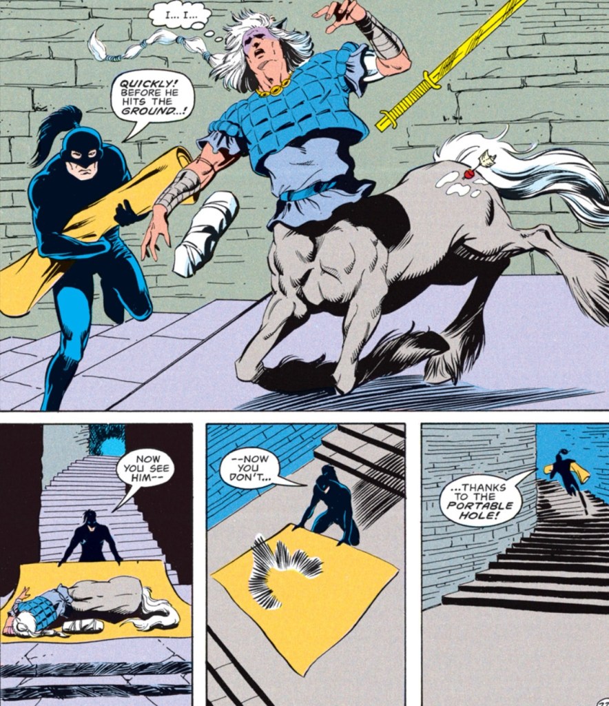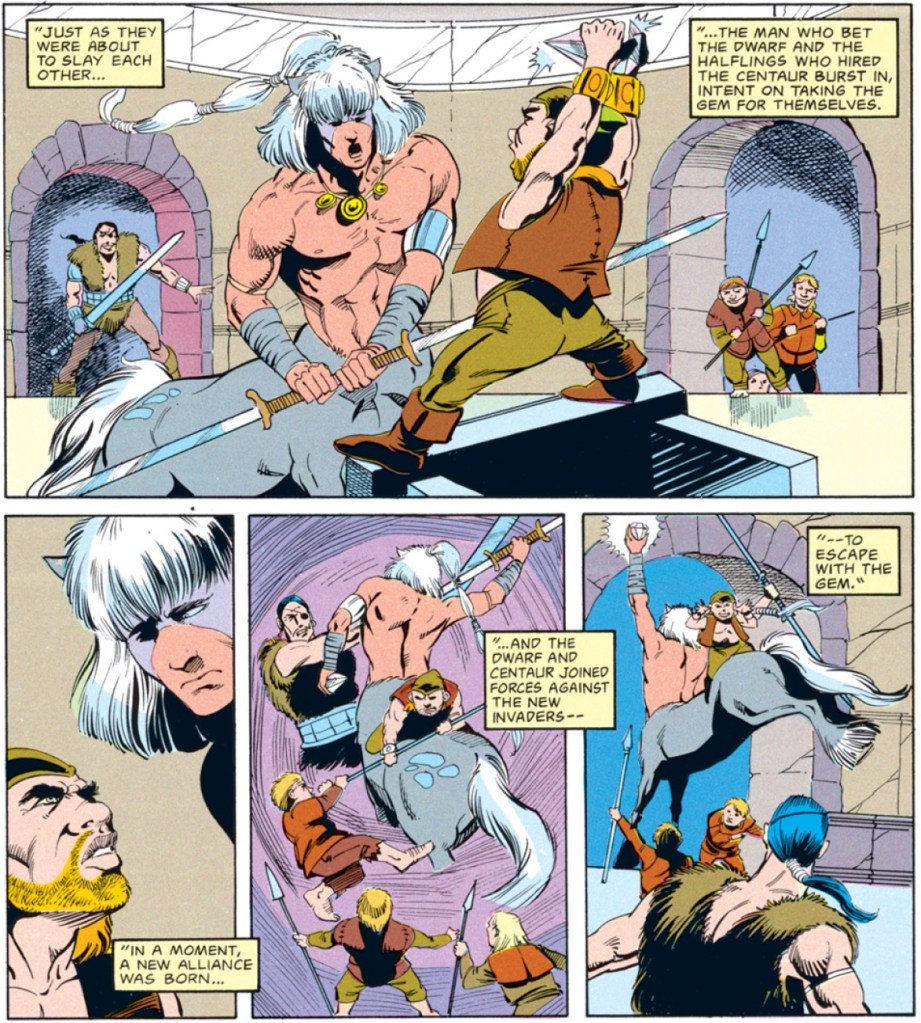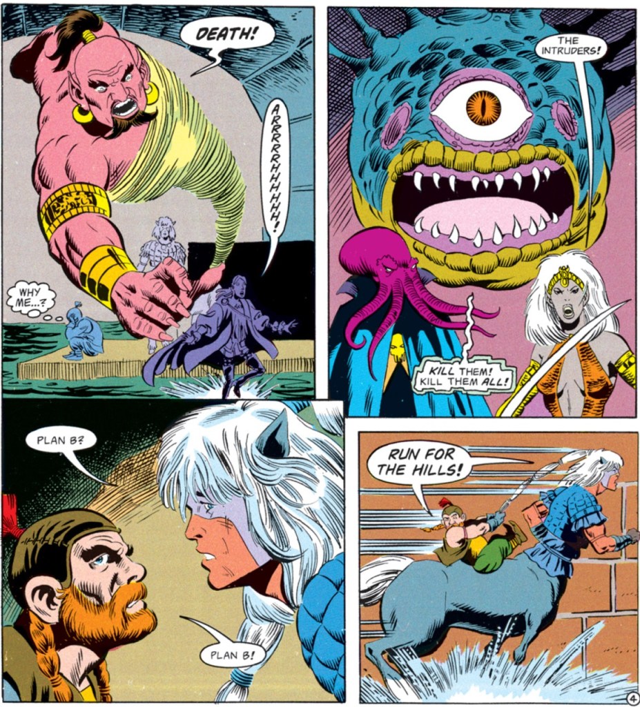 Many a gaming group knows the frustration of not being able to get everyone together on a regular basis. Often, the solution involves splitting the party; some PCs engage in the adventure at hand, while others are missing on other errands. This seems to be a feel that the Advanced Dungeons & Dragons comic was going for. In “The Spirit of Myrrth,” our centaur friend Timoth was notably absent (as was Agrivar). Now, in “Catspaw,” he’s back but the rest of the group, save his buddy Onyx, are out.
