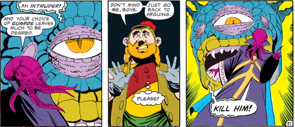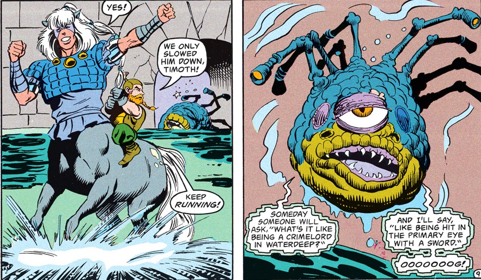 Two things: first, I love it when comics do things like having Timoth’s exposition run behind other panels. It’s something that other mediums simply cannot do. Secondly, I can understand why D&D chose to replace Xanathar with a successor after Eye of the Beholder; a slightly-insane beholder crime boss is a great NPC to have. However, just having another beholder with basically the same personality is a waste; they should have instead simply used a different foe for Eye of the Beholder, since the monster there lacks Xanathar’s general panache.
