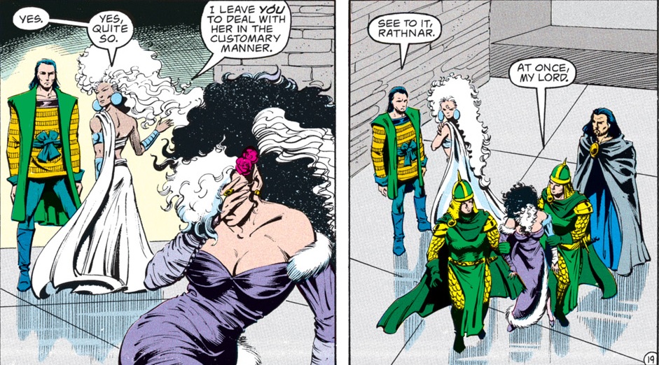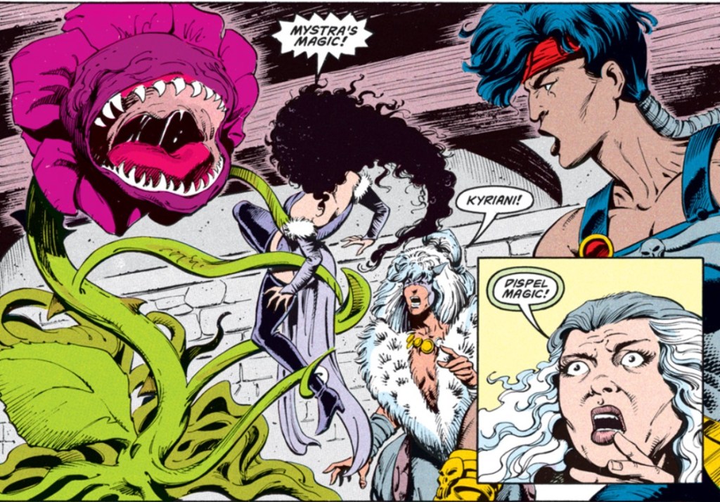 Onyx’s suspicions about Kyri are one of the reasons I liked the outcome of “The Ostus Legacy.” In short order, Kyriani seems to have put together a whole collection of suitors, and she uses one of them to get the group into a party that will bring them close to the false Selûne. The 90s frequently used the idea that flirtiness was a malevolent trait in women, and it’s nice to see Kyriani subvert that without being too fanservice-y about it.