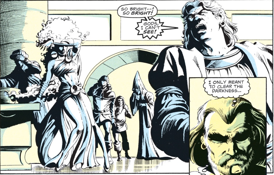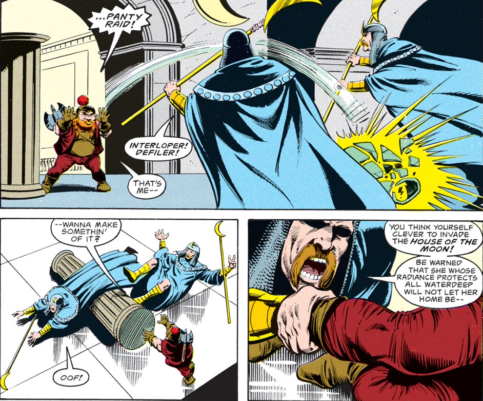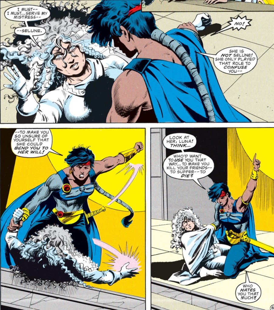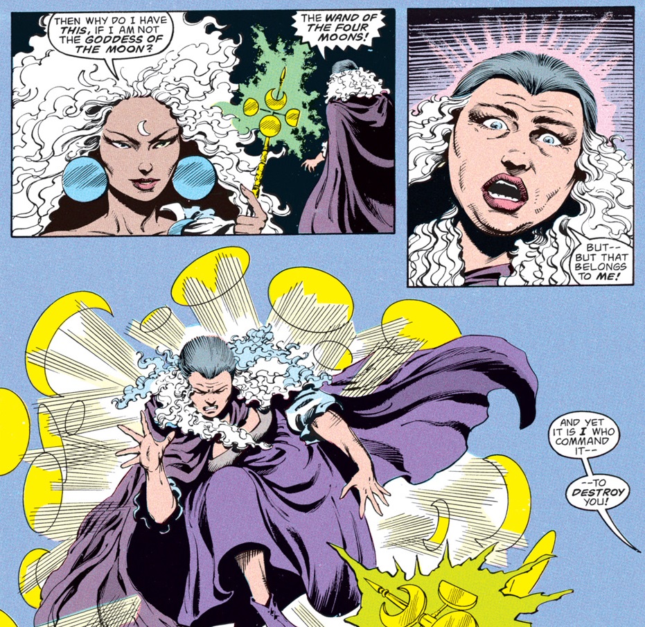 The truth is that the false Selûne is Shar. Anyone who is familiar with the Forgotten Realms as they have existed over the past 40 years probably already guessed that, but this comic served as many people’s introduction to the setting–and their first glimpse at the eternal war between Selûne and Shar.