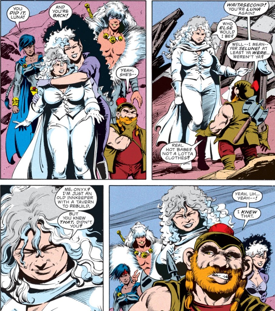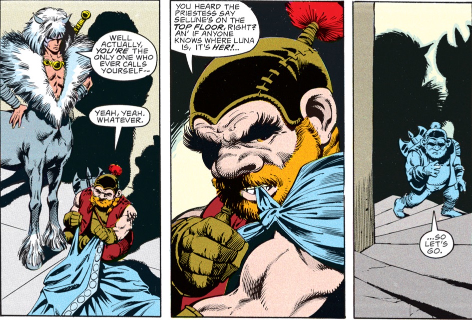Back in the House of the Moon, Onyx and Timoth fight off some hell hounds–certainly an odd choice of pet for the supposedly good goddess. Onyx takes a nasty bite but shrugs it off, stating, “They don’t call me Onyx the Invincible fer nuthin’.”