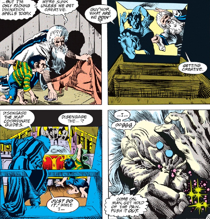 The issue kicks off with Foxy charging into Dwalimor’s quarters and getting blasted out by a gust of wind spell. Dwalimor is feeling ill and poring over his notes about artifacts. (Among the cards we see are the Hand of Vaprak, which the crew dealt with earlier, as well as Selûne’s Eye and the Moonpenguin of Boof from the AD&D comics.)