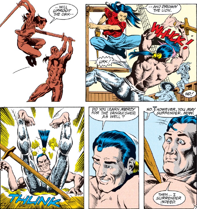 While Minder helps Dwalimor deal with chronic pain, Agrivar and Ishi spar on the ship’s deck. The paladin gets the upper hand at first, disarming Ishi, but graciously gives her weapon back so the match can continue. This proves to be his downfall.