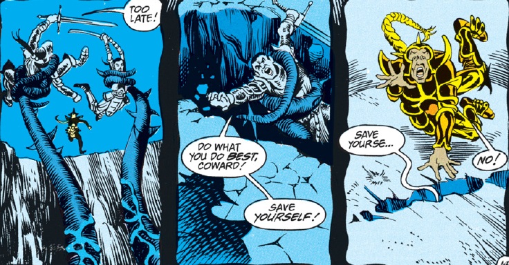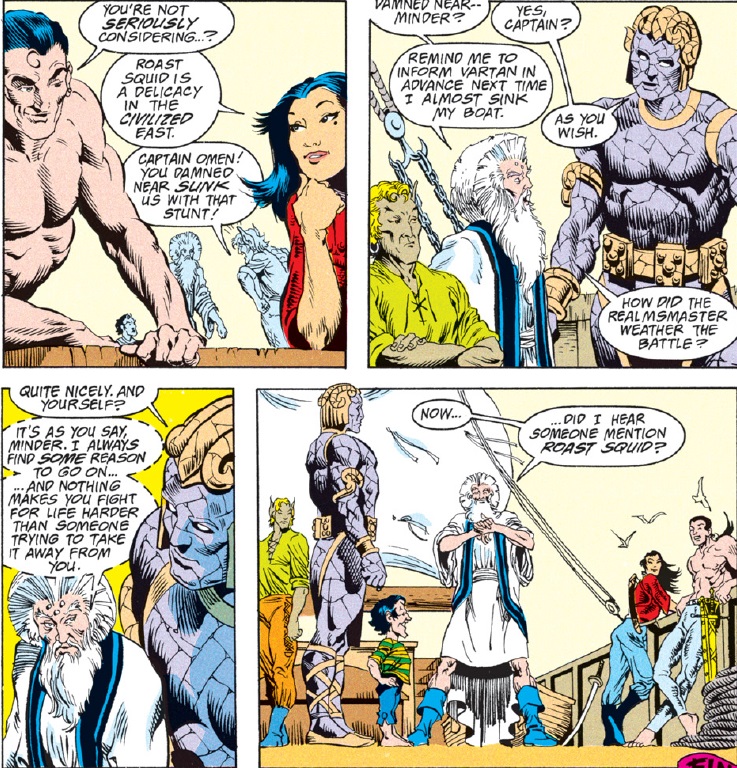Earlier in the comic, Minder told Dwalimor to find a reason to live. Now he does so, aided by the fact that he doesn’t want to become a squid’s dinner. The new coordinates transport the Realms Master about 100 feet above the giant squid. The ship lands with a thud on top of the monster, and gravity does the rest.