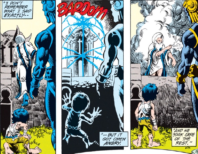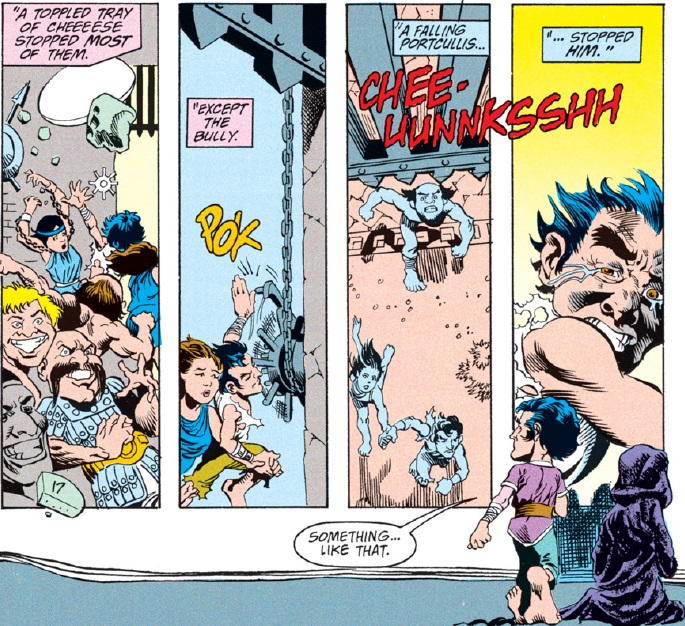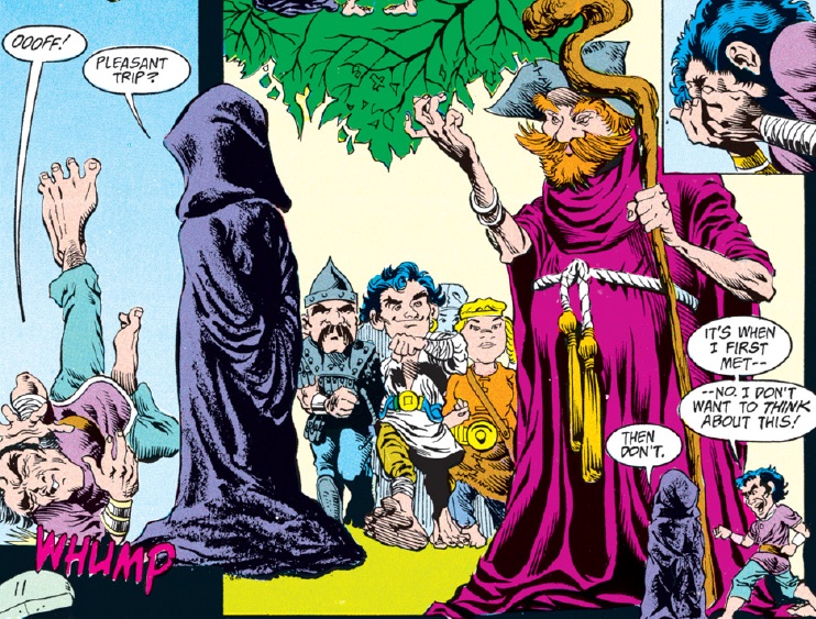 Incidentally, this synopsis doesn’t do justice to the layout of this issue, which uses panels very well. Many of them are full-page spreads, which I try to avoid copying here, but they use the black void in which Foxy finds himself very well. There’s a sense of depth as he moves from panel to panel, despite him being mostly alone with no background. Similarly, his fall into the past shows several panels that reflect his past adventures falling across the page like playing cards. It’s very well-done, and I highly recommend tracking down the story (which can be found in Forgotten Realms Classics volume 2) to see it in all its glory.