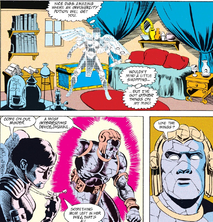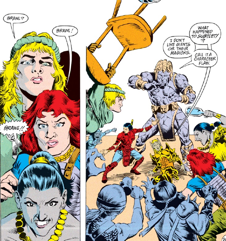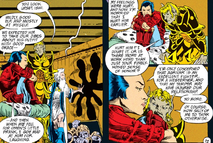 So, where does this leave us with Ishi, and how does her characterization compare to the mishandling of Vajra back in “Spell Games?” It’s a bit of an incomplete grade because the romantic subplot will continue for a while yet. But I’m very much not a fan of the fact that Ishi’s role in this comic has now been reduced to two things: fighting and pondering her relationship with Agrivar. I’m also not happy that the only interactions we’ll see between Ishi and Jasmine are going to revolve around their romantic rivalry…especially since Agrivar isn’t romantically attracted to Jasmine and is largely in the dark about Ishi’s feelings toward him.