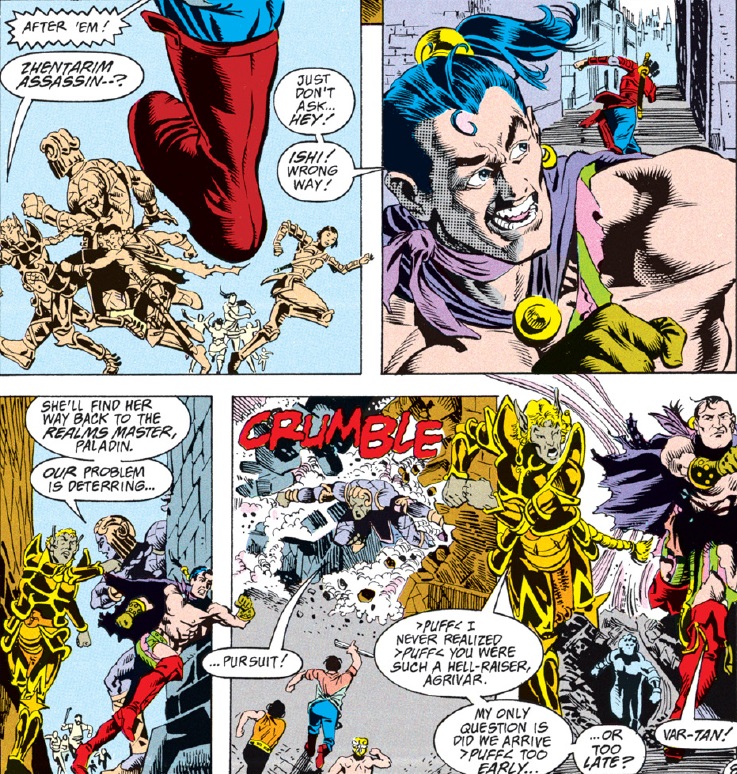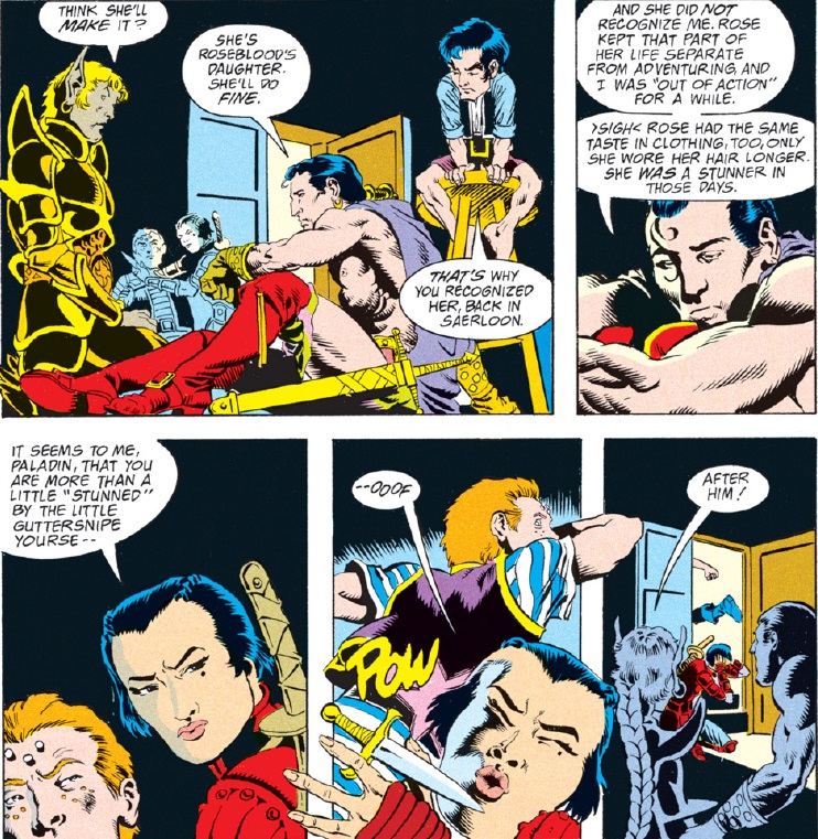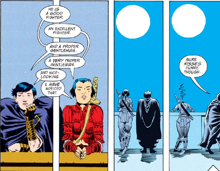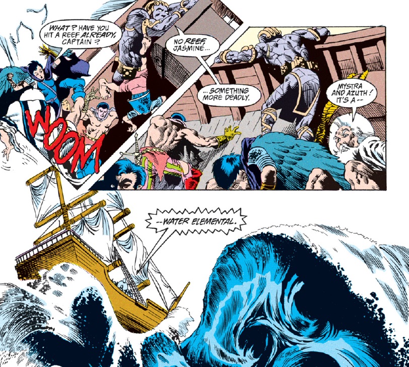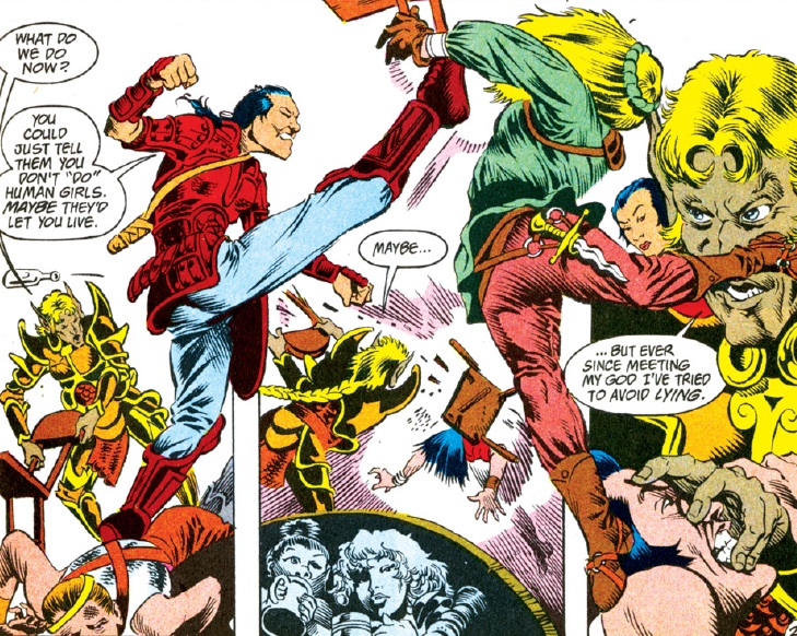 I complained previously when “Spell Games” did Vajra dirty by running through a checklist of “strong female character” tropes that were already tired by 1990. Ishi is this title’s strong female character, and she also provides east Asian representation, since her homeland of Kara-Tur is a hodgepodge of legends and stereotypes taken from our real world. Is Ishi bound for the same tone-deaf treatment that Vajra got, or does “Triangles” offer something better? Read on and judge for yourself.