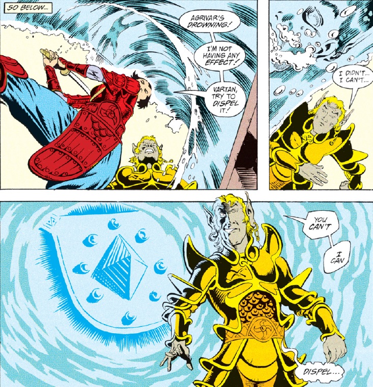 The water elemental was summoned by a mage of Halruaa, Dwalimor’s homeland. It seems there has been a power struggle, and the ruler who gave Captain Omen the Astrolabe of Nimbral which powers his ship has been replaced by one of Dwalimor’s spiteful ex-lovers.