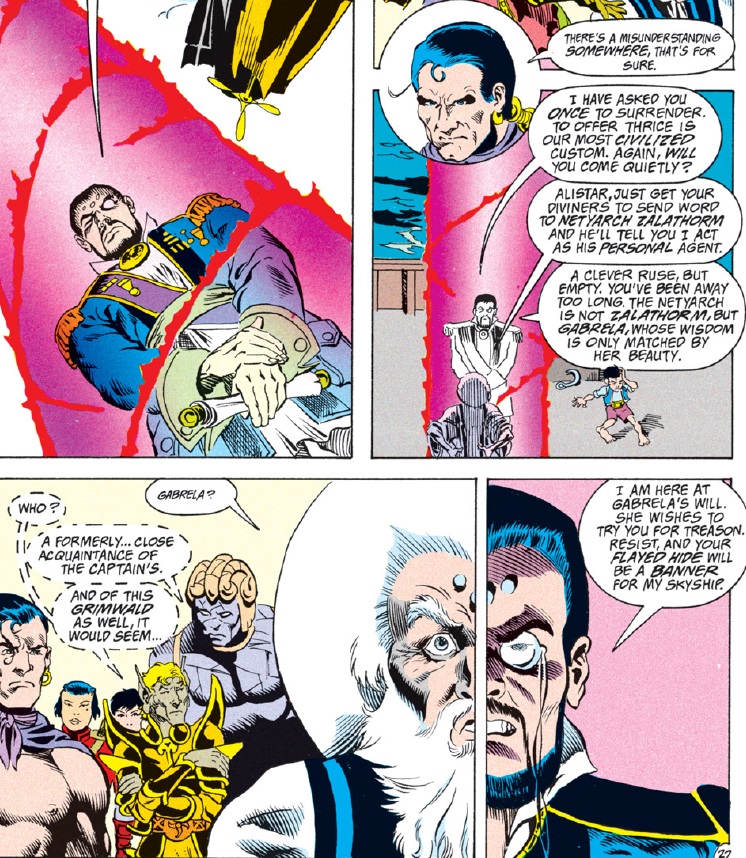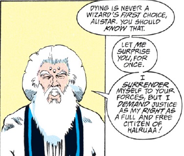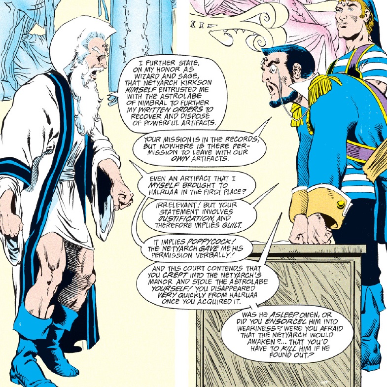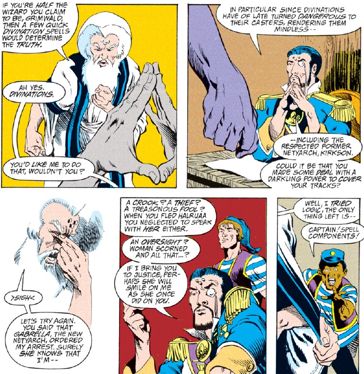 The attacking wizard, Alistair Grimwald, is an old foe of Dwalimor’s and also, it seems, a romantic rival. While he reads off Dwalimor’s alleged crimes, other mages levitate aboard invisibly, surrounding the group. Ultimately, Dwalimor chooses to surrender.