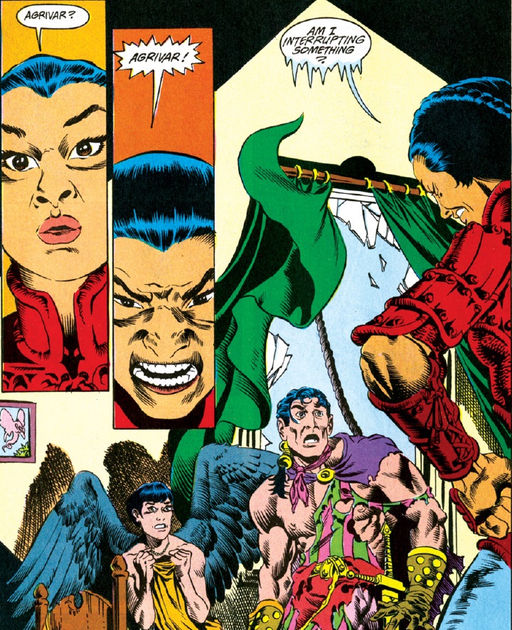 Ishi is extremely upset at finding Agrivar with torn up clothing in a room with a topless winged woman. Her reaction isn’t fair to Agrivar, but we’ll circle back to that soon enough. The woman, Jasmine, uses the chaotic scene to make her escape.