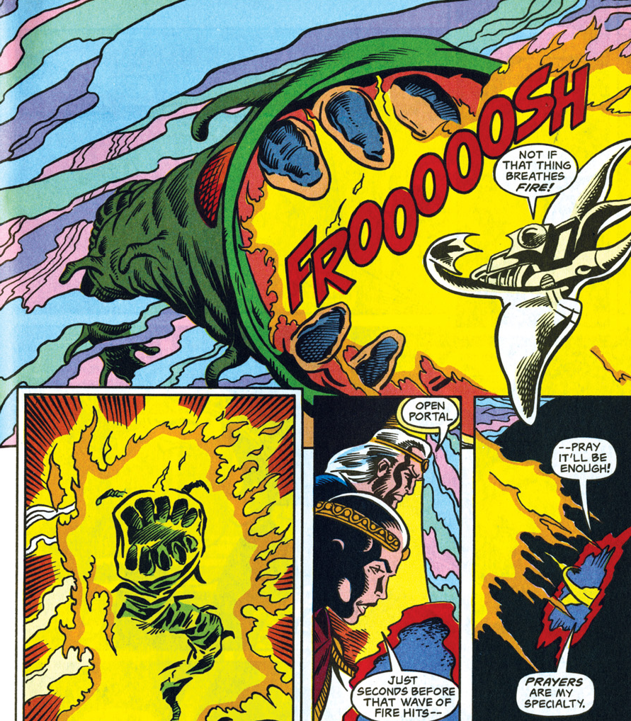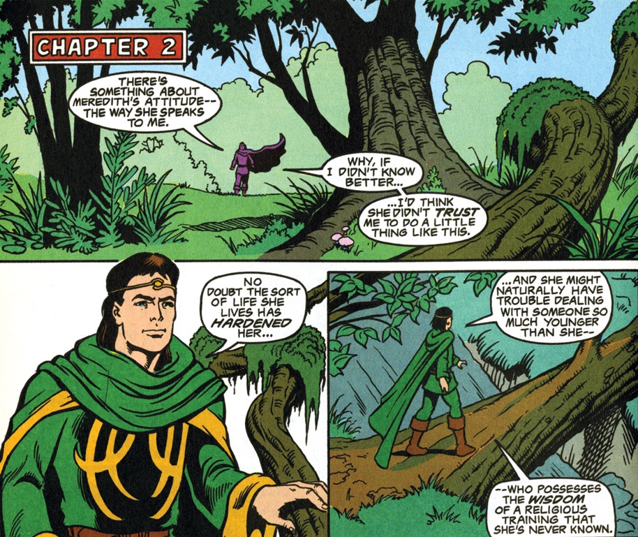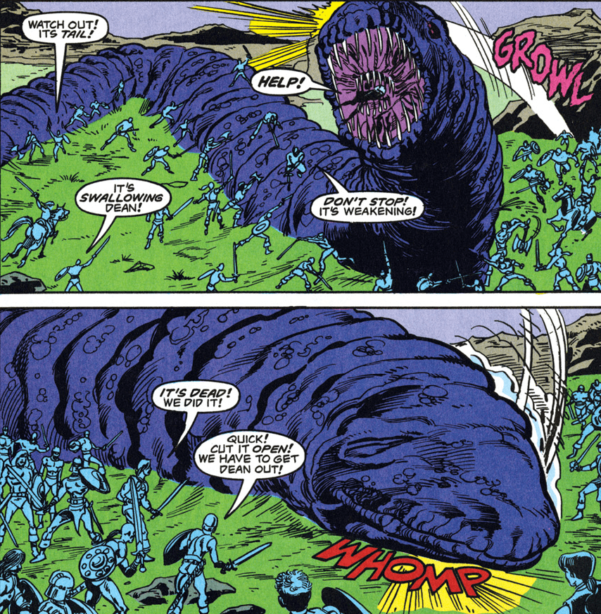 I think this poor pacing is largely a result of the issue’s need to fill so many purposes at once. It probably would have been better to give Meredith a four-issue story arc to introduce herself like the heroes of the other titles have had. Then potentially exciting encounters like a fight with a purple worm are reduced to a couple of panels.