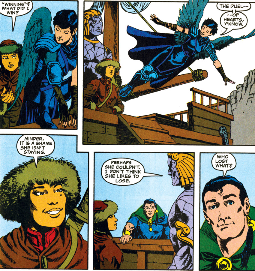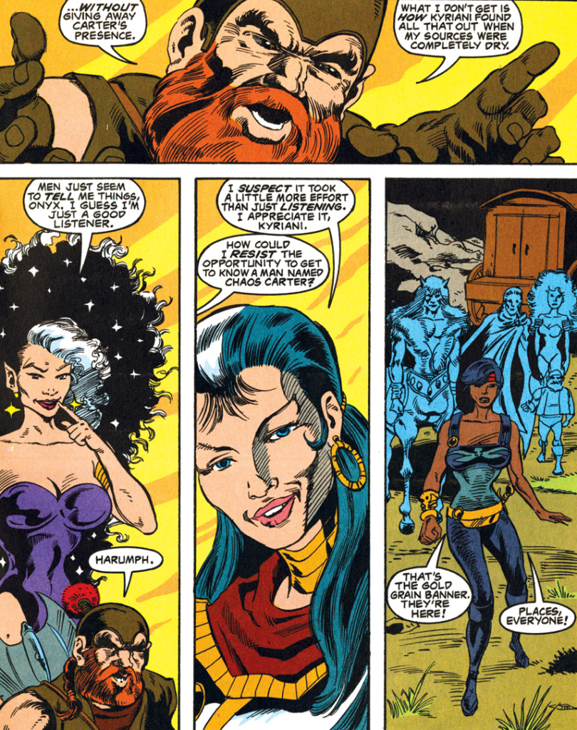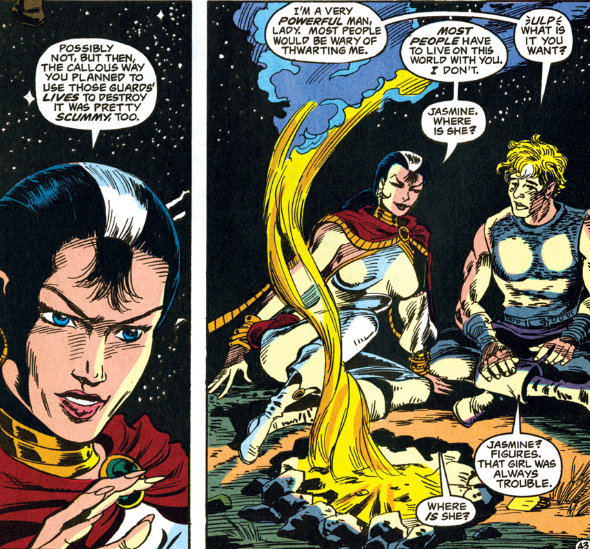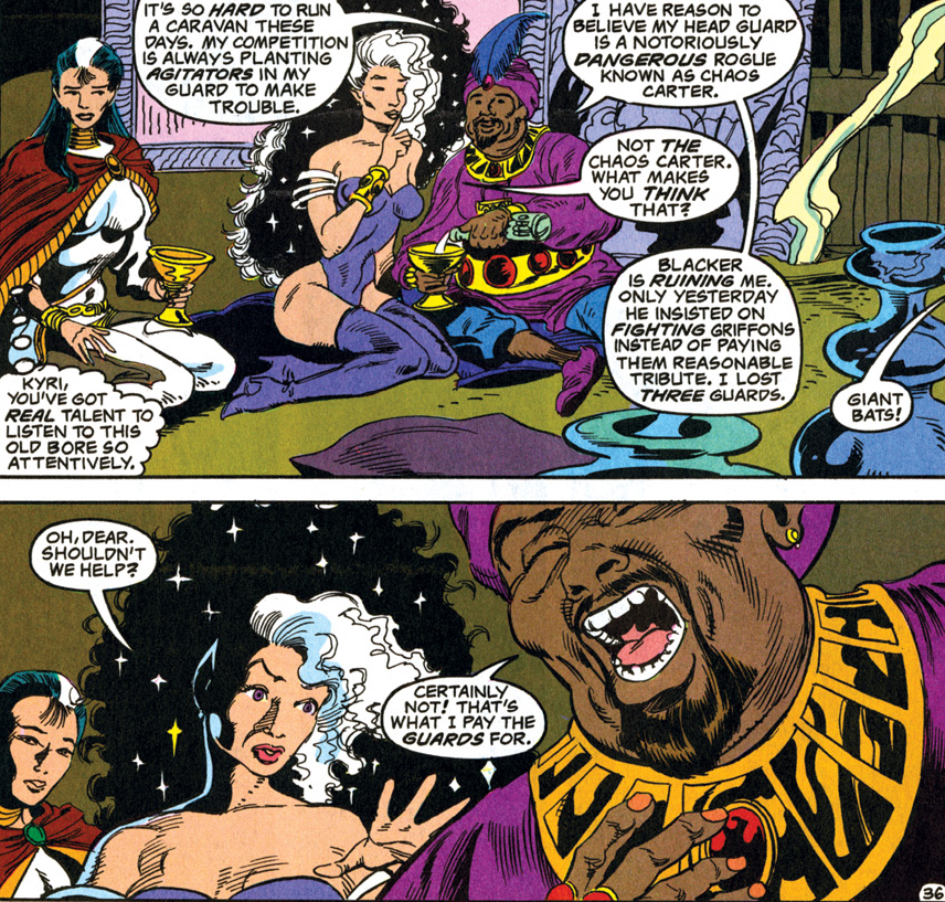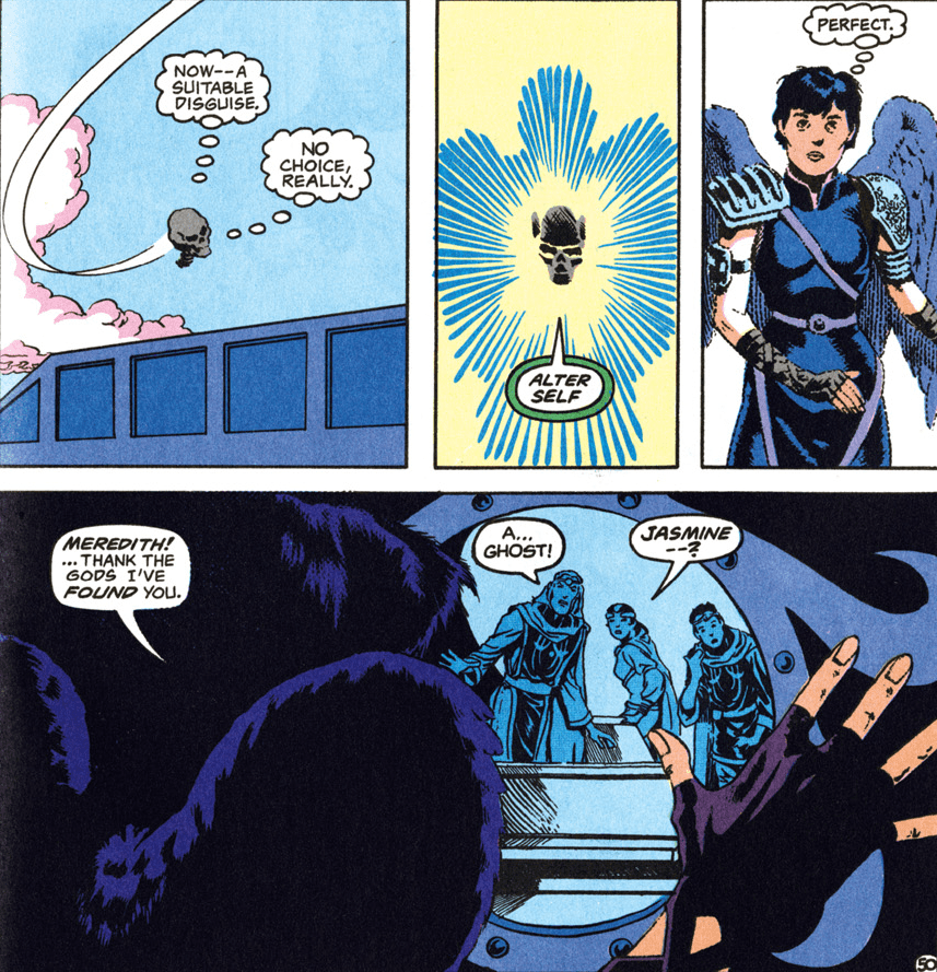 Carter left Jasmine in Saerloon (presumably shortly before “Triangles“) because she couldn’t keep a low enough profile for his liking. Meredith returns to the Spelljammer to look for her, meaning that our heroes from the Advanced Dungeons & Dragons title end their part in this story back in Selûne’s Smile.