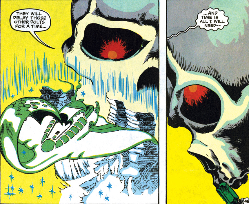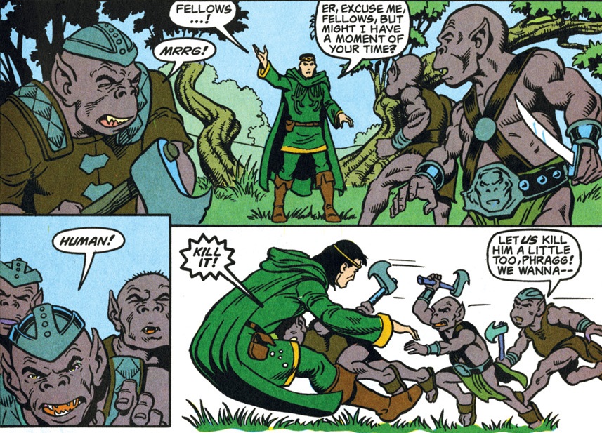 Stupid fights between heroes that could have been solved with communication is a tried and true comic book tradition, and the D&D comics make no exception. The lich who kidnapped Jasmine is looking to delay her would-be rescuers, and his floating skull minion identifies the Spelljammer crew as just the ones to do it.