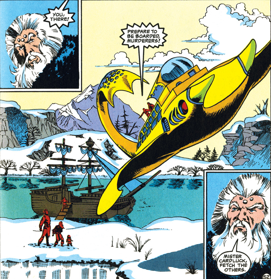 The skull uses an ESP spell to learn enough about Jasmine’s mother to convince Meredith that Jasmine is really dead. Meanwhile, Captain Omen has tracked Jasmine to a castle by honing in on the trail of her magical wings. Ship-to-ship combat ensues.