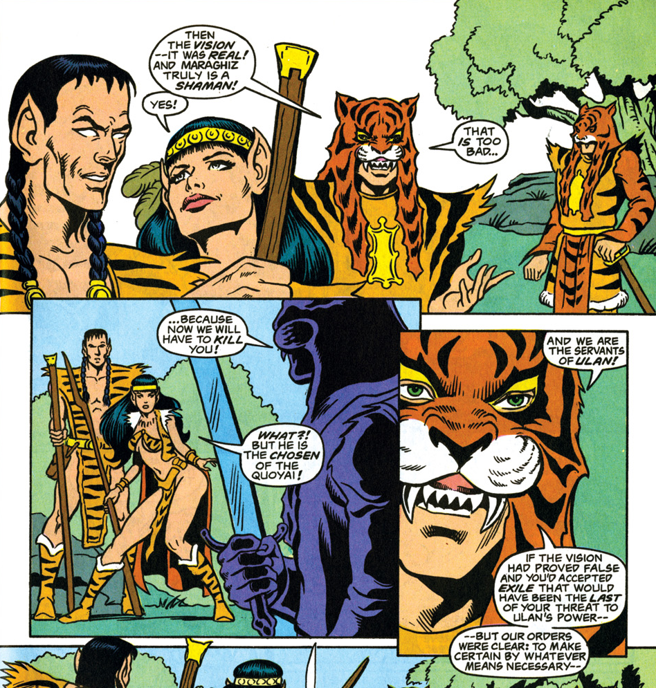 Tember only lives because some jewels fall out of his pocket and his attackers decide they should interrogate him first to get some more treasure. The negotiations go nowhere, however, because a group of tigerskin-clad warriors interrupts.