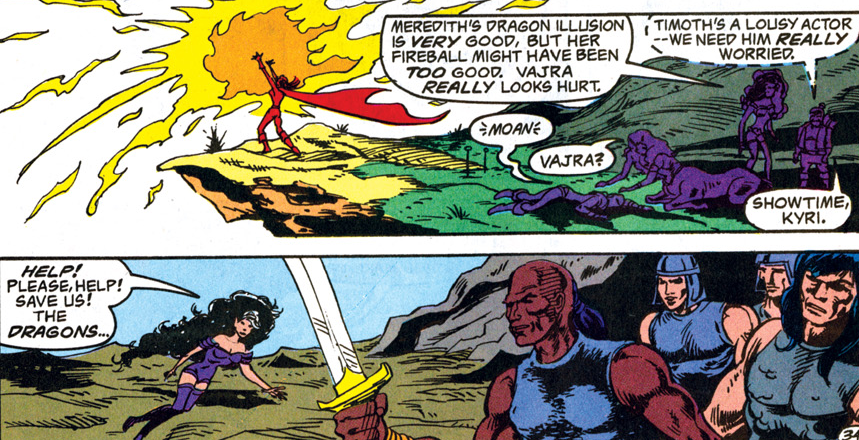 Calling Krynn “Land of the Dragons” is a bit of hyperbole, since it doesn’t have any more dragons than most other D&D settings. However, it’s a quick way to identify this world as the home of the Dragonlance setting, popularized by the novels of the same brand. Dragonlance was actually the first setting to be used in DC’s D&D comics line, but I don’t have those issues and as near as I can tell the story there doesn’t really cross over with this one.