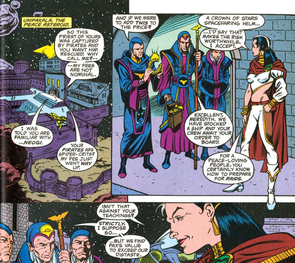 In fact, it may push things along a little too quickly. Our heroine, Meredith, is an experienced space pirate who zips from planet to planet with ease. Having seen a lot, she knows more about the setting than the audience and acts like it. If you didn’t know what neogi are, for example, all you have to go on is Meredith’s vague description of them as “spider-crits.”