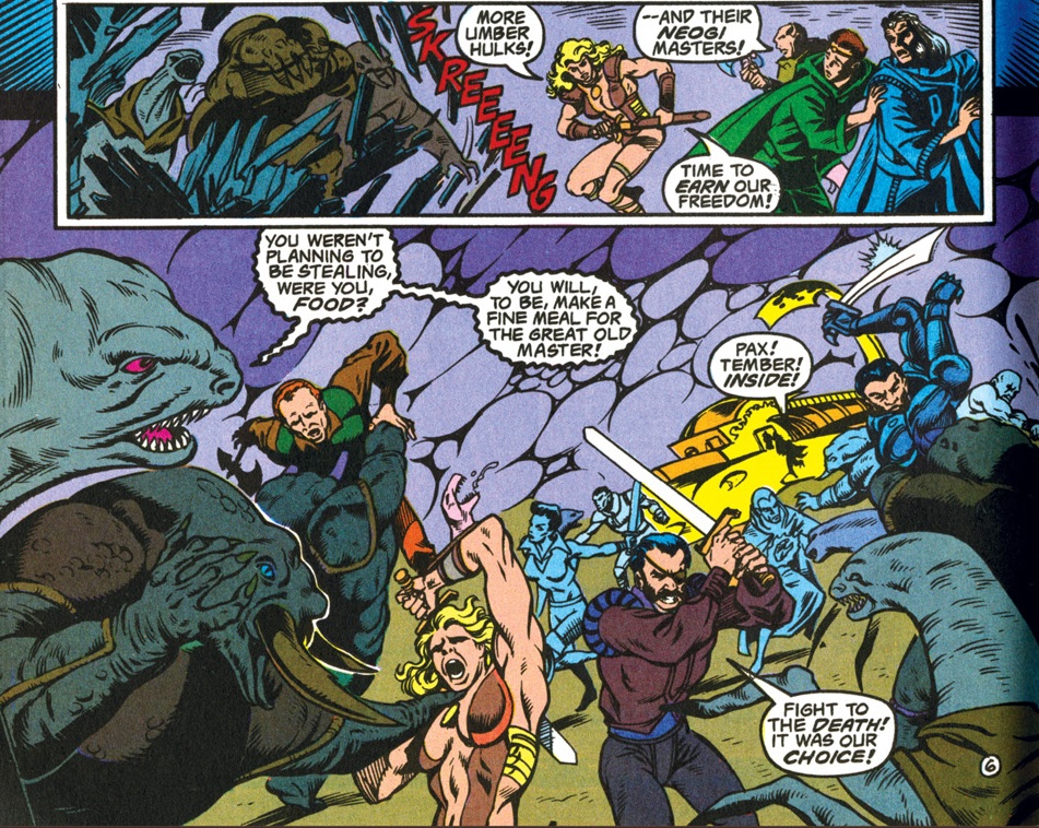By this point, the comic is reading very much like a dull D&D adventure: one encounter after the other strings together, and it’s mostly just a way to showcase creatures from the Monster Manual. There’s not much logic to the encounters, and none of them showcase any clever strategy for bypassing them: everyone just hits with their swords until the thing is dead and then waits for the next monster to come along.