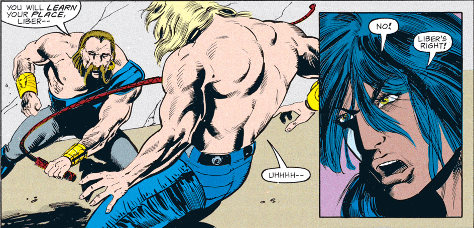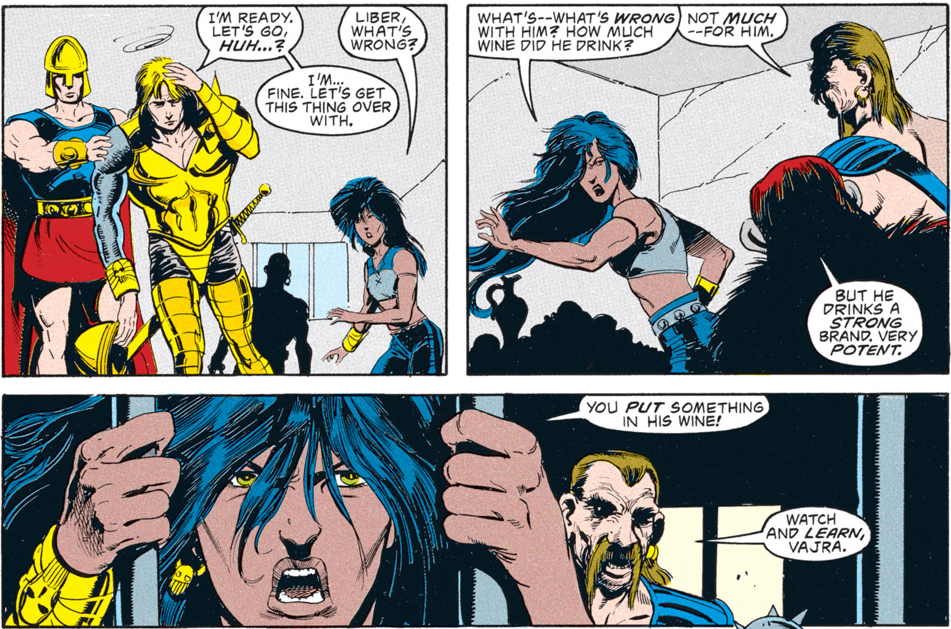 Concerned that Liber’s talk of liberty will influence Vajra, their master Abon Duum has somebody spike his wine before he goes out to fight. They make sure that Vajra sees the fate of anybody who dares to speak out against oppression.