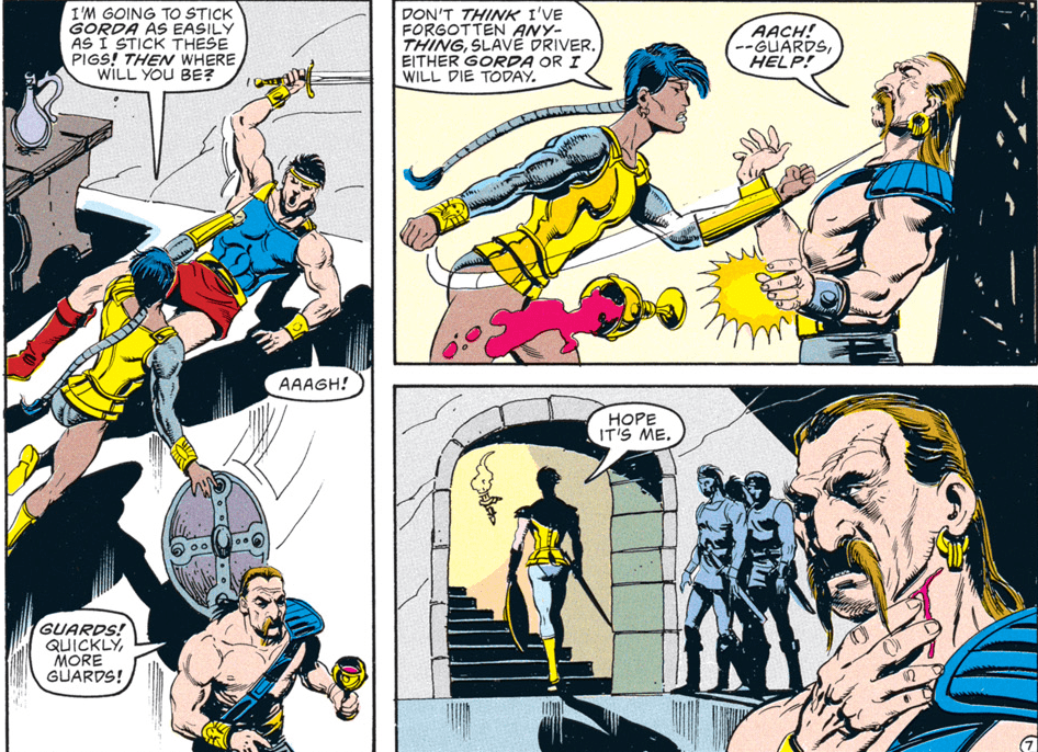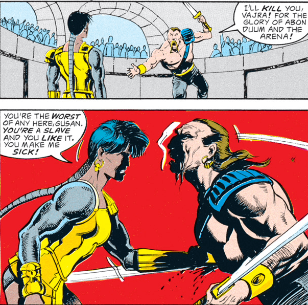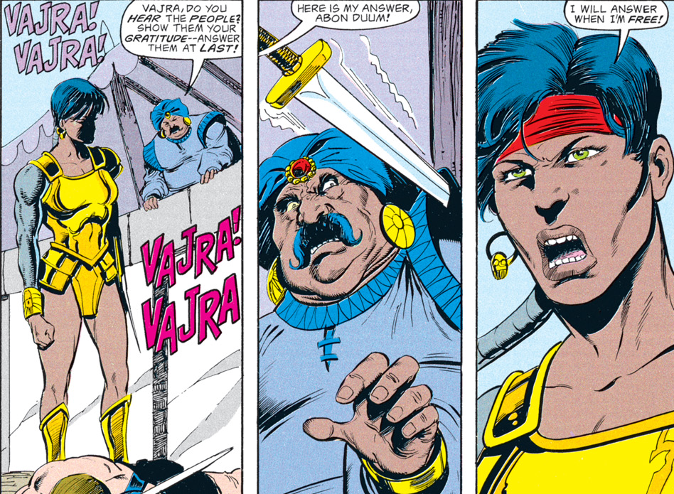This story is a pretty bleak one. We know it would be a while before Vajra finally escaped from Duum, and the people she kills in vengeance were slaves themselves, albeit ones who chose to throw their lot in with their master and turn against their fellow prisoners. But any story about slavery has to be pretty bleak because the practice is so abhorrent and terrible.