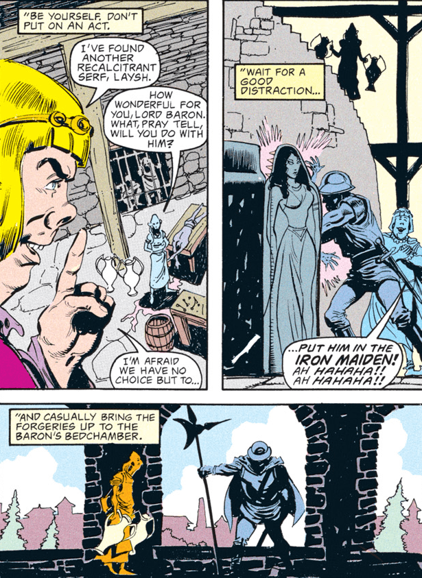 Laysh wants to rob the young baron of his valuables for the slight of bringing in an iron maiden to torture victims.