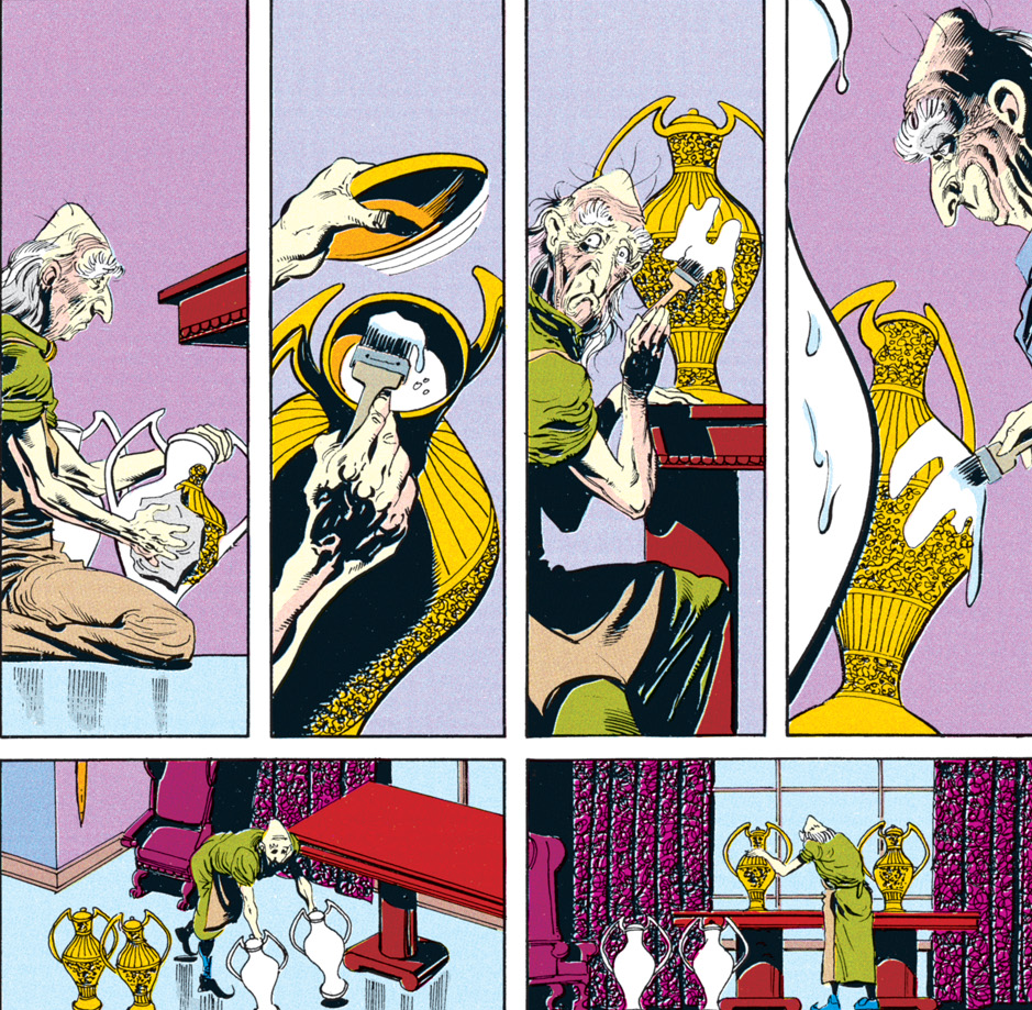 Laysh brings the urns to the Baron’s bedroom, where we discover that they are filled with paint. He then swaps the forgeries out and paints the real urns to disguise their transport.