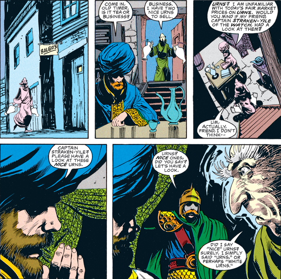 It turns out that Balgio doesn’t know the price of urns very well. Luckily, he has a friend in the city watch who can help…