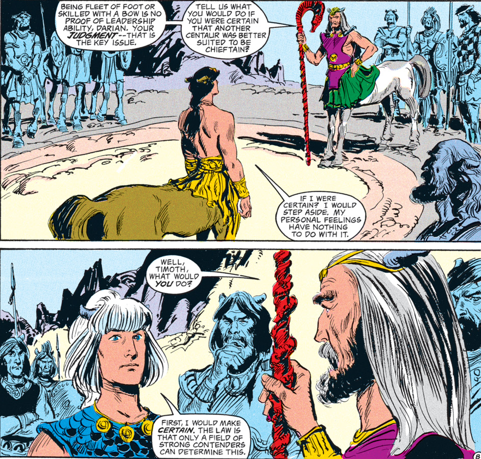 Timoth observes that Bryon has the virtues of a great warrior but the faults of a tyrant. Determined not to let such a man lead his people, he throws aside his own chance to make sure that Darian wins.