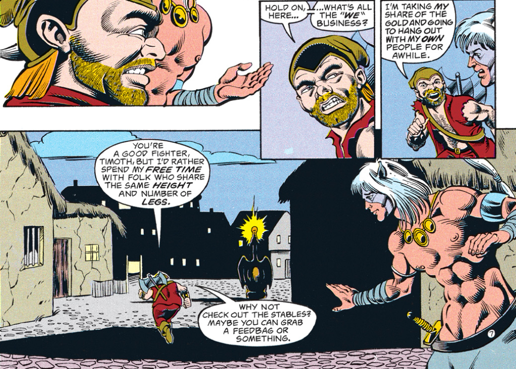 Onyx and Timoth have just recovered a magic item they had hoped to sell, but which is cursed. As always, Timoth plays the optimist, pointing out that they at least got a few gold for it. Onyx, surly as ever, tells Timoth to buzz off in a quite unkind way before heading off to drink with some dwarves.