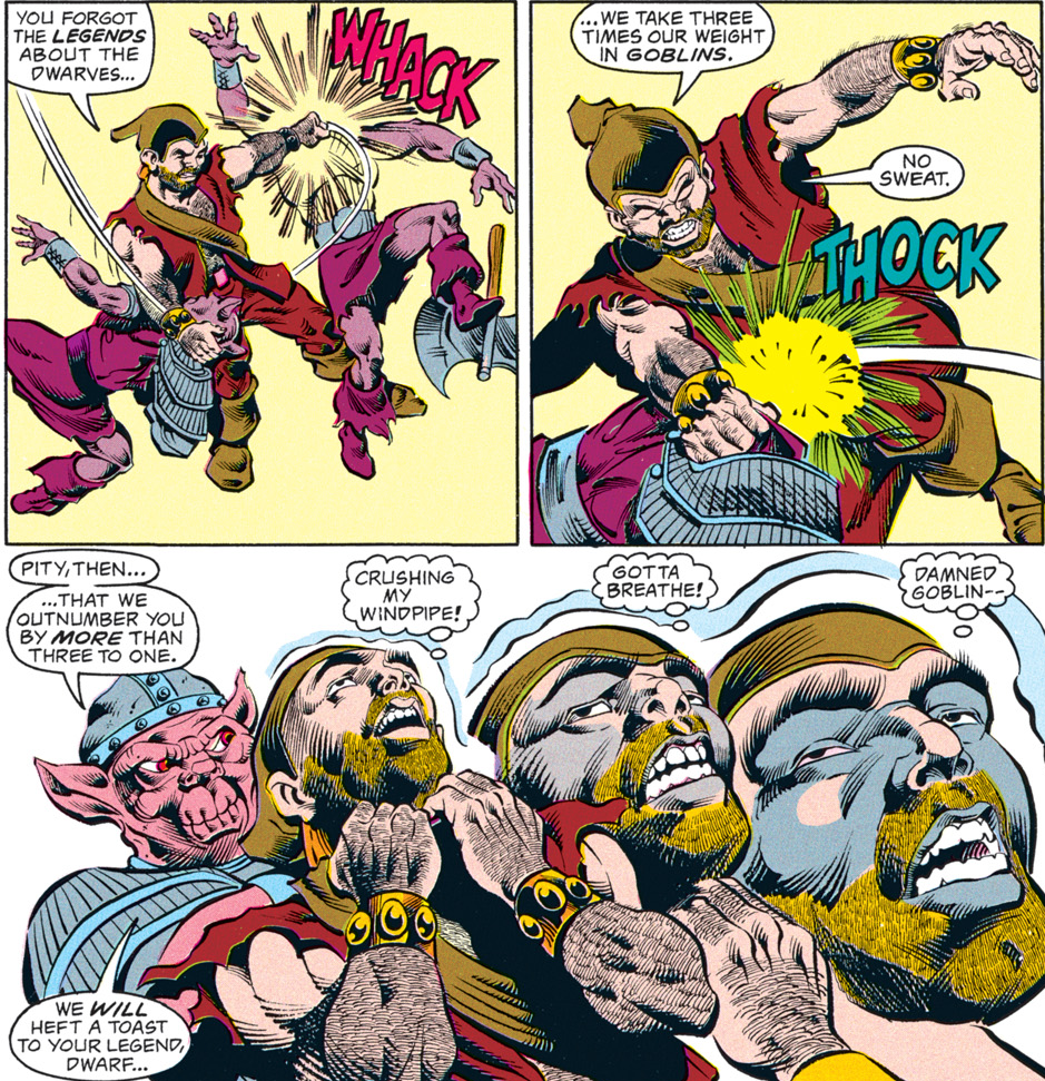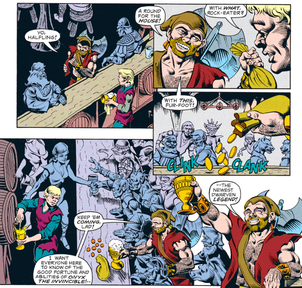 The goblins circle back to Onyx and ask for more beer. Onyx tells them to buzz off, which starts a fight as they try to kill the “new dwarven legend.” Onyx gives a good account for himself, but he’s outnumbered.