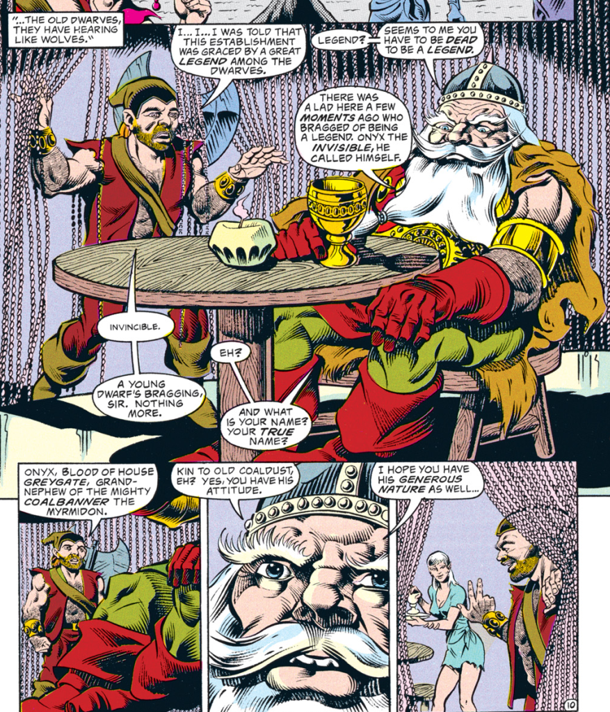 Onyx soon hears that a legendary dwarf named Stormhammer Silverbars is at the tavern, and he rushes to meet him. Stormhammer plays into many of the dwarven stereotypes, including his love of drink.