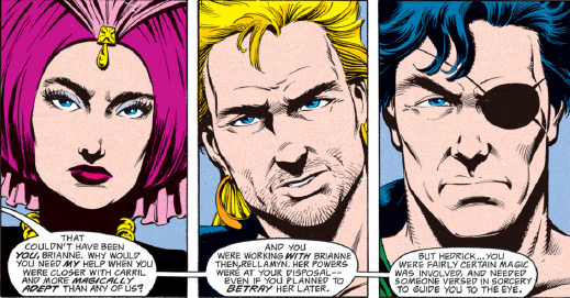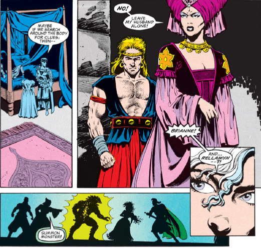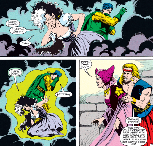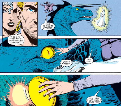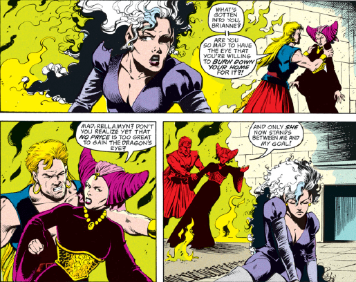 And so we come to the story’s climax, with Kyri, Hedrick, Rellamyr, and Brianne all vying for possession of the Maguffin…er, Dragon’s Eye. Brianne gets things started in a fiery way, nearly torching her own home.