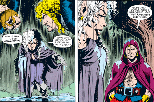 Reverted to his mortal form, Hedrick plummets into the harbor and Rellamyn refuses to go looking for him because, “From that height, he was dead the instant he hit the water.” I guess the blond dummy doesn’t feel like working overtime, because he himself survived a fall not too long ago thanks to an act of magic.
