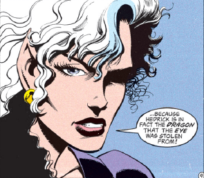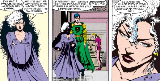 As we pass the halfway point in the story, Kyri hides out at the home of Fenn, another of her lovers. She has a creepy dream involving Carril, who says the Dragon’s Eye is his now and forever. Carril strangles Kyri, and she wakes after making the sort of face that I would swear was traced from porn if this comic wasn’t a decade ahead of the days of the infamous Greg Land.