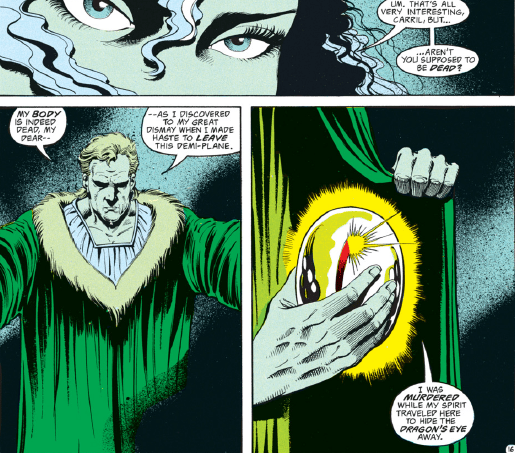 Kyri buys some time by going through the detective routine of recapping our mystery and revealing the killer. Carril’s murderer had to be somebody who would kill him for the Dragon’s Eye but then needed to sic Kyri on the trail to find where it was magically hidden…