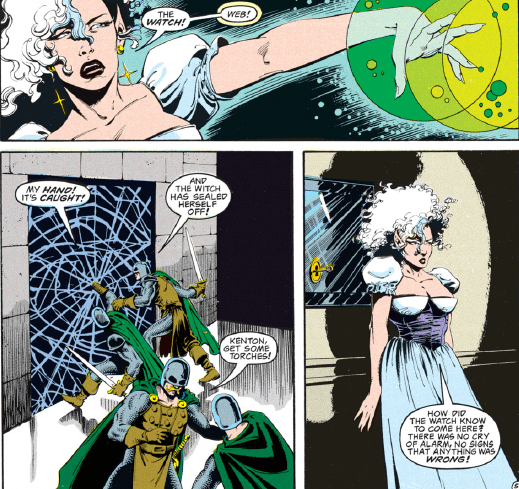 The web buys her a little time, but the treasure she seeks is already gone. The guards burn through the webbing, meaning that it’s time for Kyri to beat feet.