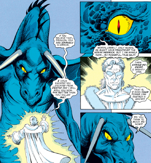 Rellamyn and Kyri try to escape on the flying horse, but the dragon closes in quickly. Then, suddenly, he gets disturbed by a visit from beyond the grave.
