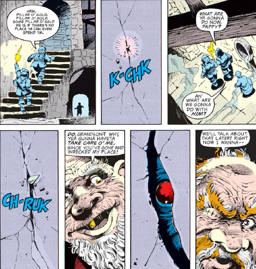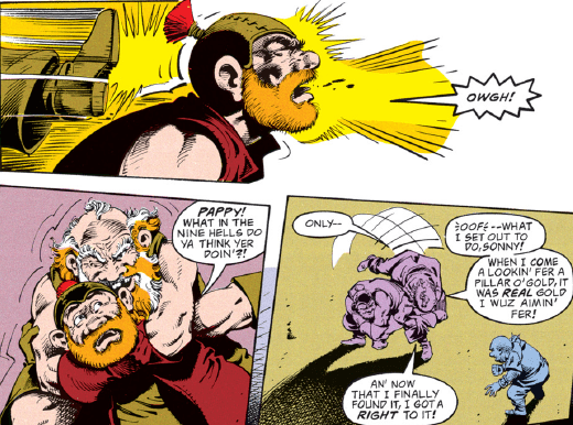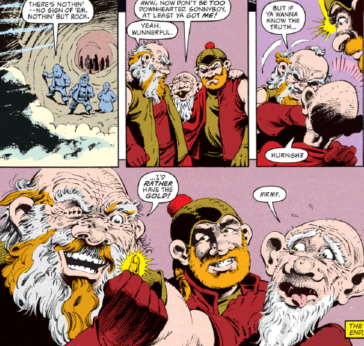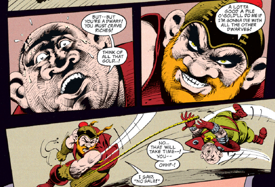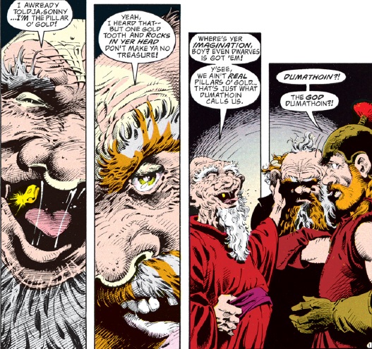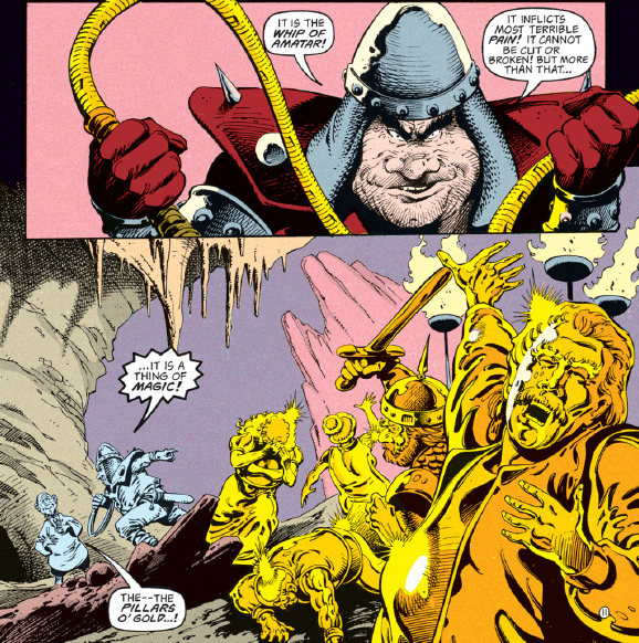 Grysygonth believes in an old legend that says that the last dwarf will regain the magic lost by his ancestors. Apparently, he interprets that to mean that the dwarves will be able to cast spells once the Pillars of Gold are gone. With a crack of his whip, he turns Onyx’s grandpappy to gold just as the other two dwarves arrive.